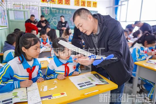 2024年3月1日,在科学小课堂上,老师指导学生制作橡筋动力模型飞机。