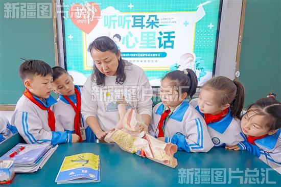 2024年3月1日,昌吉市第二小学老师用耳朵模型向学生讲解耳朵的构造及如何科学安全用耳。