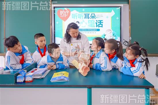 2024年3月1日,昌吉市第二小学老师用耳朵模型向学生讲解耳朵的构造及如何科学安全用耳。