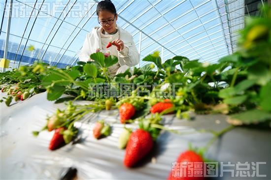 2024年3月3日,游客在哈密国家农业科技园区温室大棚里采摘草莓。