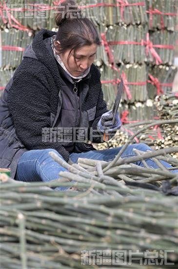 2024年3月5日,焉耆回族自治县七个星镇哈尔莫敦村村民在加工树苗。