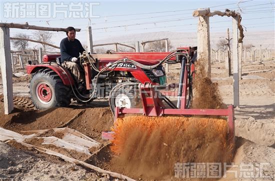 2024年2月29日,鄯善县鲁克沁镇赛尔克甫村村民驾驶机械为葡萄开墩。