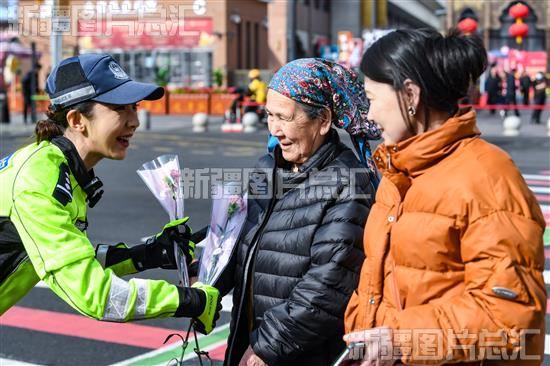 2024年3月8日,3月8日,在乌鲁木齐市解放南路大巴扎步行街美食街出口处的爱心斑马线上,一名交警为路过女性群众送上鲜花。