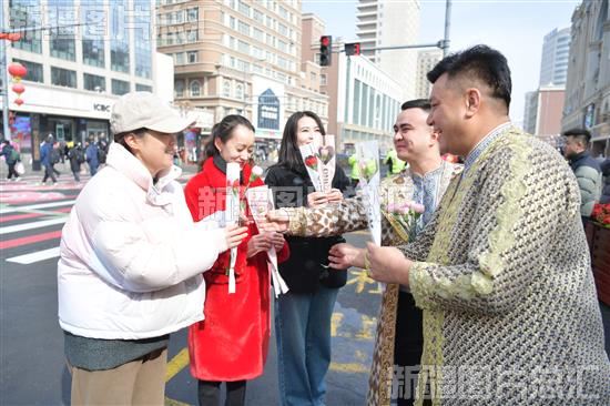 2024年3月8日,志愿者在新疆国际大巴扎步行街美食街出口处的爱心斑马线上为路过女性群众送上鲜花。
