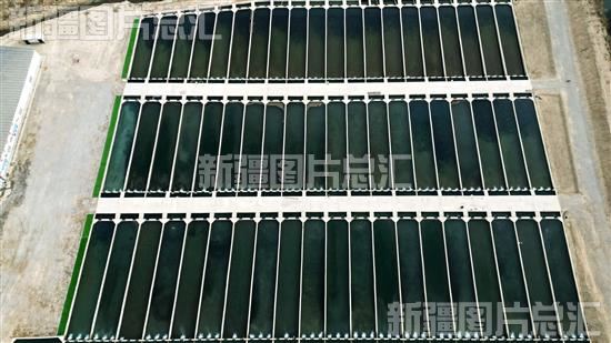 俯瞰乌什县峻鼎渔业开发有限责任公司冷水鱼养殖基地长条形鱼池(2024年3月7日摄)。
