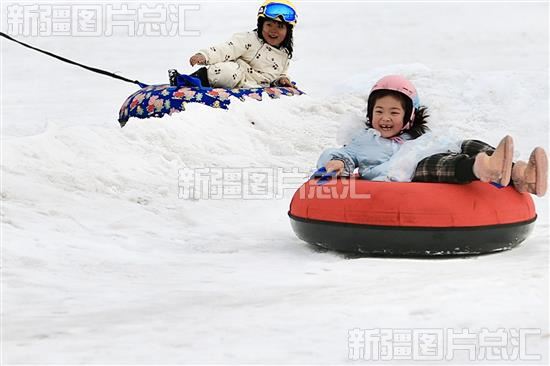 2024年3月10日,小朋友在新疆白云国际滑雪场玩雪圈。