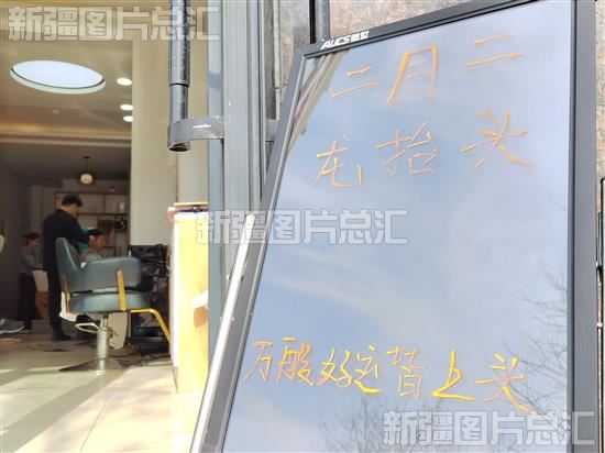 2024年3月11日,店主在乌鲁木齐市鲤鱼山北路一家理发店门口放置“二月二 龙抬头”主题的牌子招徕客人。