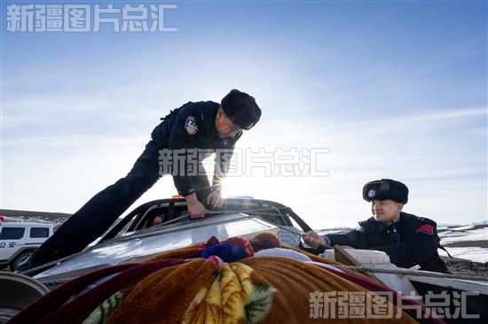 2024年3月16日, 在昌吉回族自治州北塔山边境牧场,新疆出入境边防检查总站昌吉边境管理支队乌拉斯台口岸边境派出所民警帮助牧民转运生活物资。