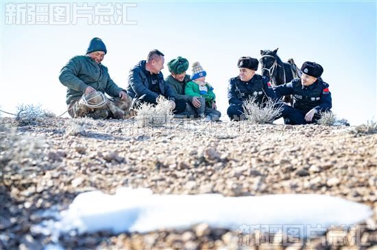 2024年3月16日,昌吉回族自治州北塔山边境牧场,新疆出入境边防检查总站昌吉边境管理支队乌拉斯台口岸边境派出所民警在护送转场途中了解牧民需解决的困难。