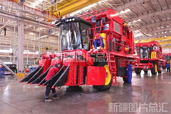 2024年3月12日,工人在新疆天鹅现代农业机械装备有限公司采棉机生产线上忙碌。