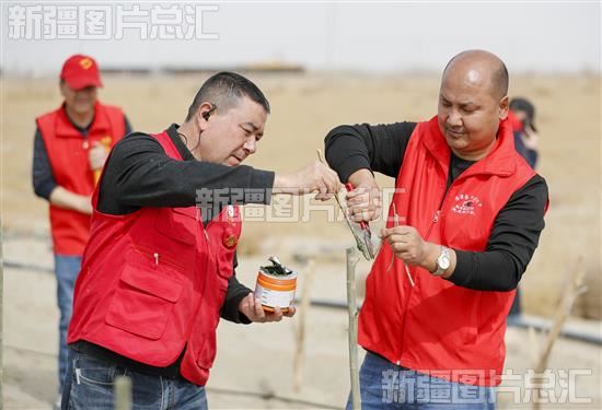 2024年3月12日,志愿者在洛浦县杭桂镇和佳新村植树造林点给新种植的树苗涂抹伤口愈合剂。