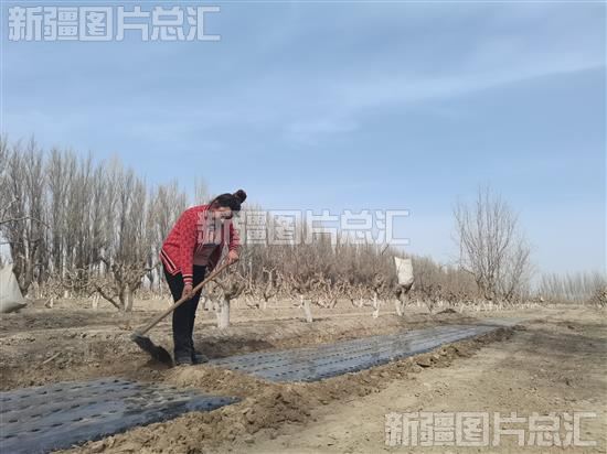 2024年3月11日,泽普县奎依巴格乡光明村村民为地膜压土。