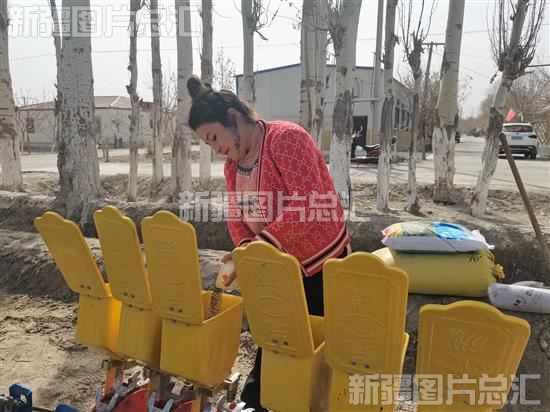 2024年3月11日,泽普县奎依巴格乡光明村村民为播种机添加洋葱种子。