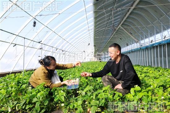 2024年3月12日,游客在位于阿勒泰市拉斯特乡的阿勒泰市吉林援疆现代农业博览园草莓种植基地采摘草莓,体验采摘乐趣。