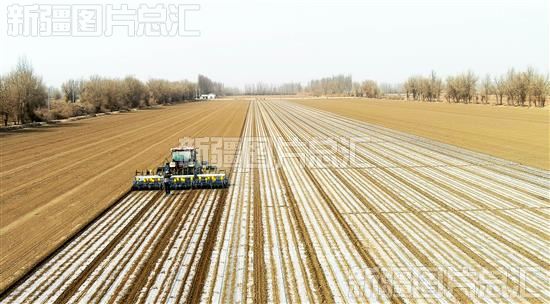 2024年3月19日,新疆生产建设兵团第一师10团职工在高标准化农田里驾驶装备北斗导航的农机播种棉花(无人机拍摄)。