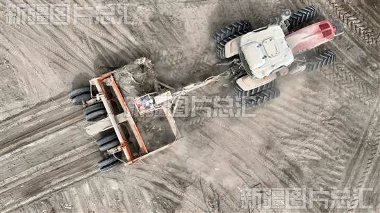 2024年3月20日,库尔勒市托布力其乡艾力坎土曼村村民驾驶农机平整农田(无人机摄)。