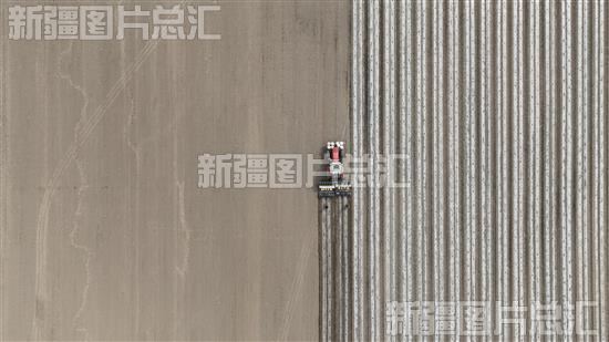 2024年3月26日,在库车市阿拉哈格镇巴扎村的玉米套种孜然高产示范田里,孜然播种机正进行播种作业(无人机拍摄)。