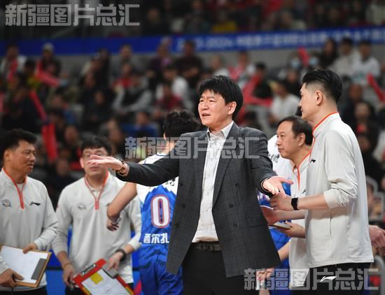 2024年3月24日,新疆男篮主教练邱彪在场边向球员示意。