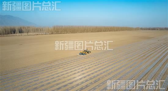 2024年3月26日,精河县大河沿子镇额勒森陶勒盖北村农田里,搭载北斗导航系统的大马力农机在农田里来回穿梭播种早熟西瓜。