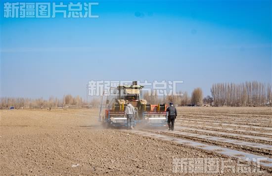 2024年3月26日,精河县大河沿子镇额勒森陶勒盖北村农田里,搭载北斗导航系统的大马力农机在农田里来回穿梭播种早熟西瓜。