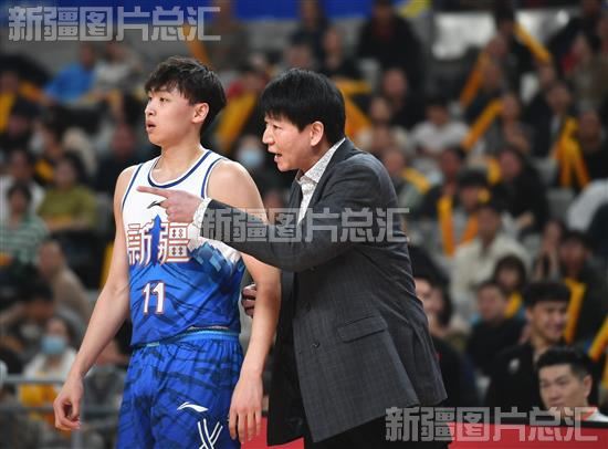 2024年3月10日,新疆男篮教练邱彪在场边给齐麟布置战术。
