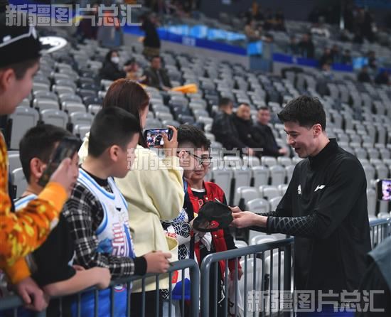 2024年3月10日,新疆男篮队员阿不都沙拉木为小球迷签名。