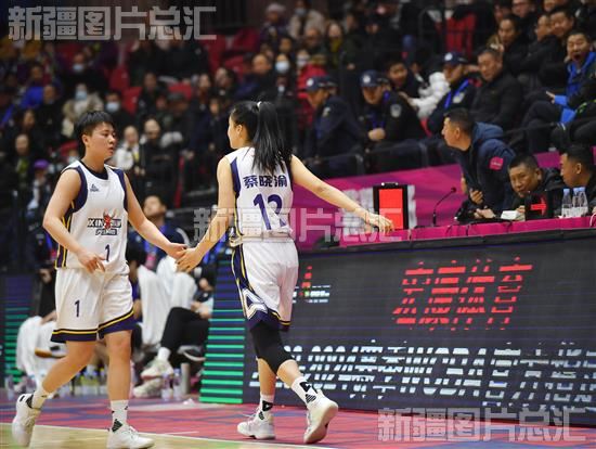2024年2月27日,新疆女篮队员李玉琼(左)与蔡晓渝(右)击掌换下场休息。