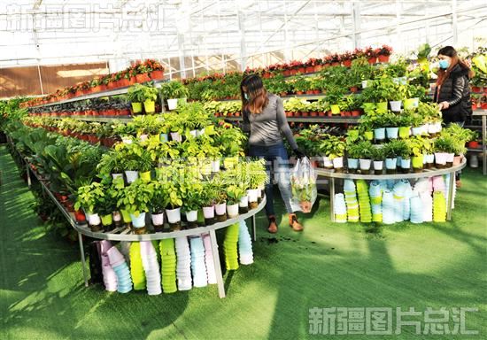 2020年3月9日,顾客在伊宁县萨地克于孜乡智能温室大棚的花卉超市里选购花卉。