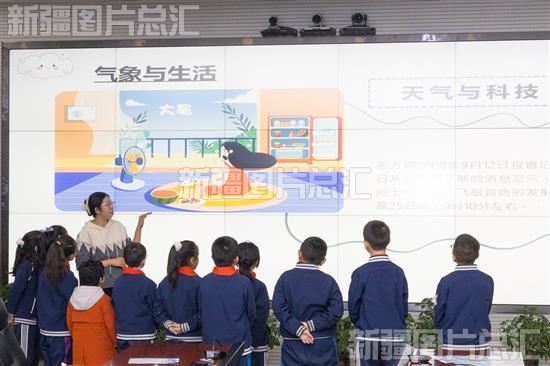 2024年3月20日,工作人员正在给学生们讲解新疆天气知识。