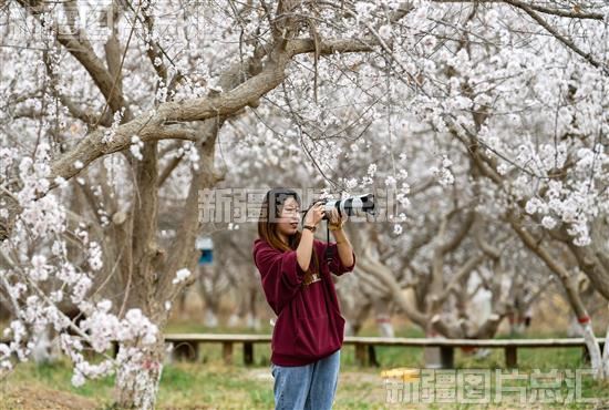 2024年3月30日,游客在柯坪县杏花村景区拍摄杏花。