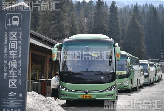 2024年3月28日,游客准备乘坐区间车在天山天池景区游览。
