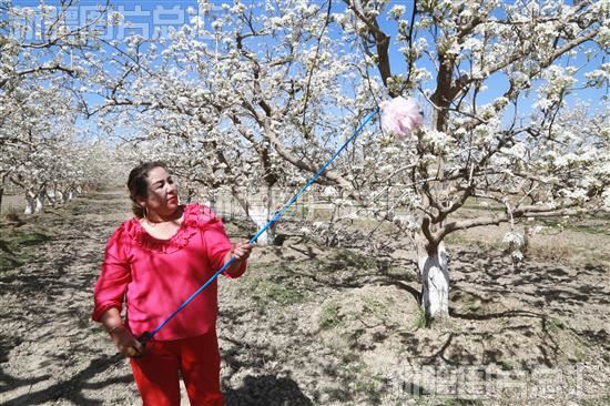 眼下,阿瓦提县2.7万亩梨树进入盛花期,当地果农抢抓农时给梨花授粉,提高梨树坐果率,为今年丰产丰收打好基础。
