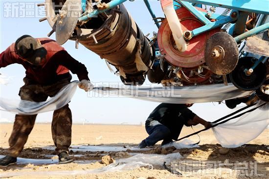 2024年4月8日,昌吉市二六工镇幸福村村民在辣椒地里给铺膜播种机装配薄膜和种子。