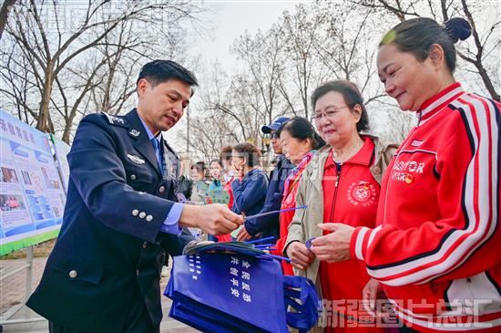 2024年4月8日,民警在昌吉回族自治州总体国家安全观主题公园给群众发放国家安全知识宣传品。