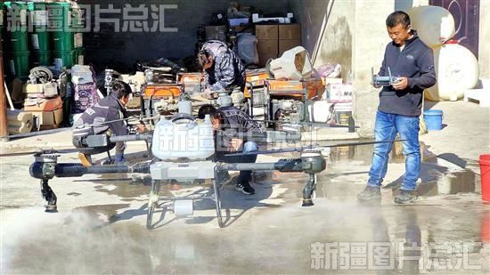 2024年4月1日,技术人员在察布查尔锡伯自治县松果农业科技有限公司查看无人机作业前喷洒功能。