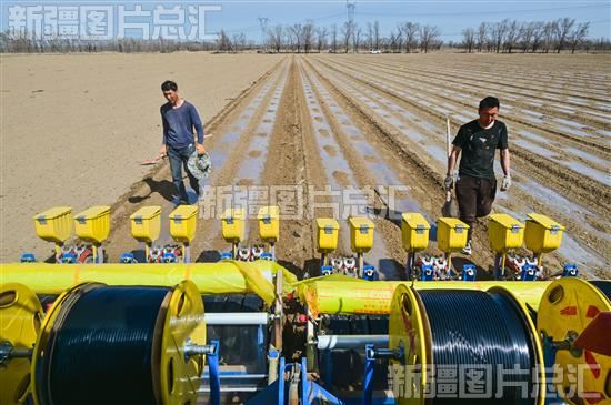 2024年4月11日,在昌吉回族自治州呼图壁县大丰镇联丰村的棉田里,一台棉花播种机在北斗卫星导航系统的精准定位下播种棉种,跟车工人对播种质量进行检查,田间地头一派繁忙景象。