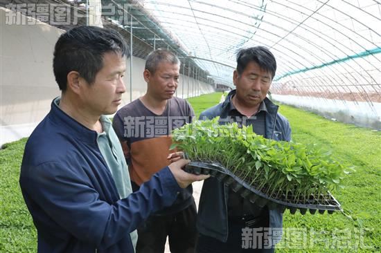 2024年4月11日,新疆生产建设兵团第一师二团职工在查看色素辣椒苗长势。