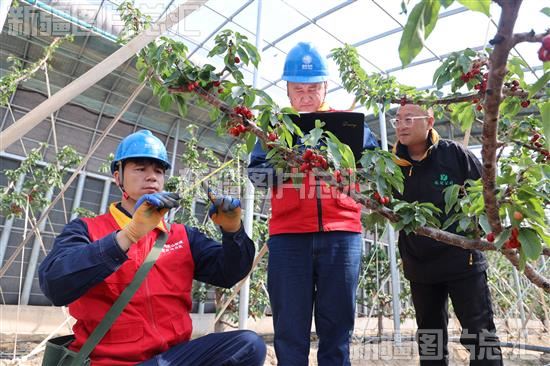 2024年4月11日,国网乌什县供电公司员工在乌什县阿合雅镇吐曼村设施农业樱桃种植大棚里了解用电需求。