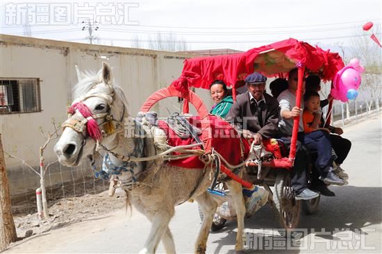 2024年4月13日,游客在乌什县奥特贝希乡杏花乘坐“马的”游玩。