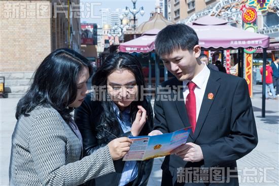 2024年4月15日,乌鲁木齐市天山区司法局工作人员在新疆国际大巴扎景区向游客宣传法律知识。