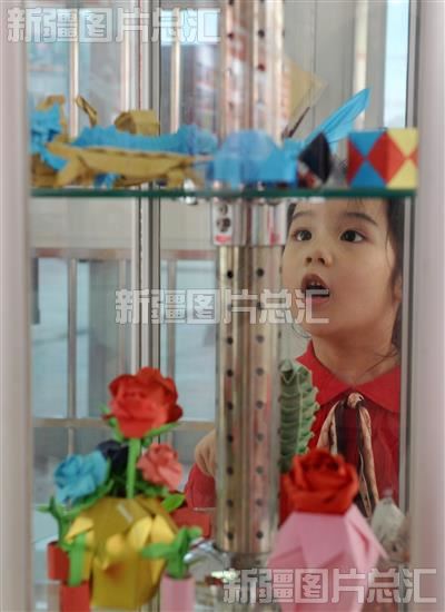 2024年3月22日,乌鲁木齐经济开发区(头屯河区)中亚北路街道迎宾桥社区,小朋友在参观展示柜里展陈的折纸作品。迎宾桥社区专门为乔景军设置了折纸作品展示柜。