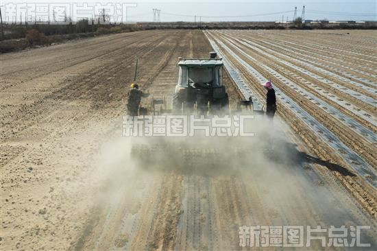 2024年4月23日,哈密市伊州区大泉湾乡黄芦岗村板蓝根种植基地里,播种机正在作业。