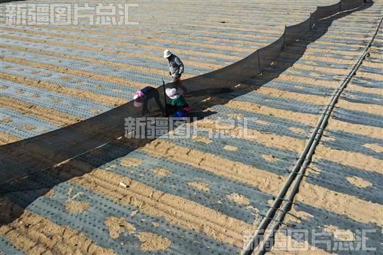 2024年4月23日,哈密市伊州区大泉湾乡黄芦岗村板蓝根种植基地里,农户正在加固防风网。