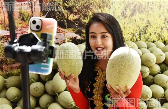 2024年4月26日,新疆吐鲁番市鄯善县吐峪沟乡哈密瓜种植基地,网络主播在推介大棚哈密瓜。
