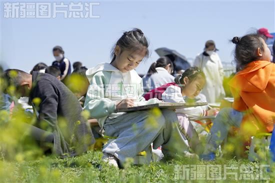 2024年4月27日,小朋友在湿地草原写生绘画。金志骠摄