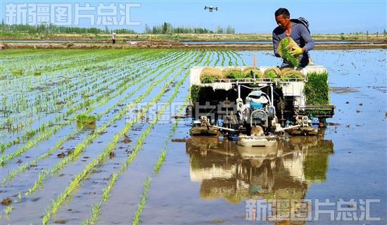 眼下正是水稻插秧好时节,在察布查尔锡伯自治县察布查尔镇安定村,一块块水田波光潋滟,稻农正忙着驾驶水稻插秧机在稻田里来回插秧。该村今年种植水稻1068亩。