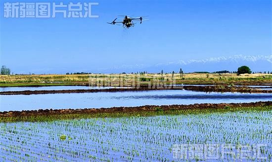 2024年5月10日,植保无人机在稻田上空来回穿梭施肥和喷洒除草剂。
