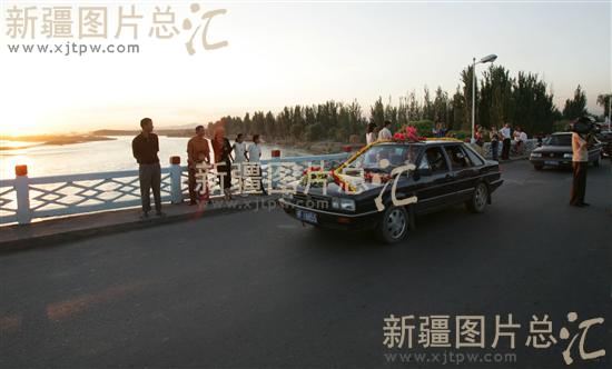 在伊宁市有一个习惯,维吾尔族、哈萨克族、俄罗斯族都是在傍晚时举行婚礼。当新郎把新娘从家中接出来时,迎亲和送亲的队伍会合在一起,纷纷来到伊犁河大桥。他们让伊犁河为这一对新人作见证,伴随他们走向婚姻的殿堂,走向美好的生活。