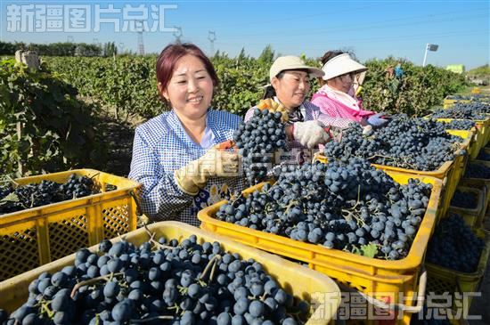 2024年9月19日,在新疆昌吉回族自治州玛纳斯县酿酒葡萄种植基地,农民正在采摘、搬运、分拣、装篮,田间地头一派丰收景象。