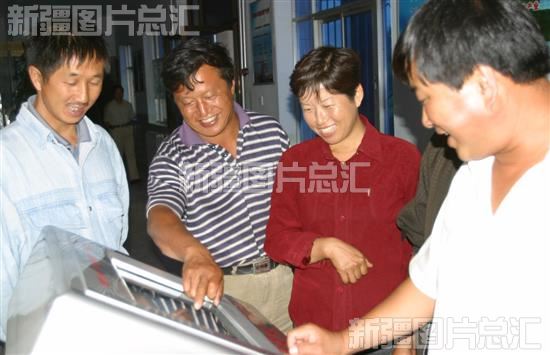 2004年7月19日,玛纳斯县兰州湾镇兰州湾村农民在触摸式电脑上查看财务信息。村委会在这台电脑上公开发布村里的政务、财务资料和信息,村民们查阅各种数据非常方便。